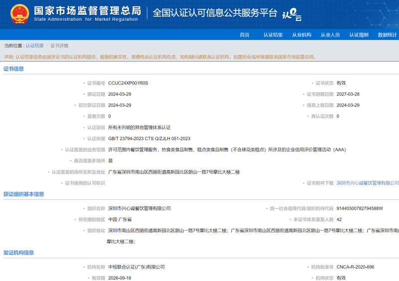 中檢聯(lián)合認(rèn)證(廣東)有限公司評審深圳市興心誠餐飲管理有限公司順利通過認(rèn)證!